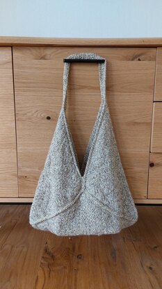 The SOW bag is woven in three parts. Each part is in the shape of a square. The squares are knitted in a circle, from the middle to the edges. Each square is folded to form a triangle and then the parts are joined. The handle was crocheted with Tunisian crochet.