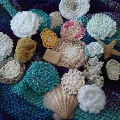 Circular pads filled with loops to use in the bath instead of a washcloth or overly-scratchy loofah. These lather better while giving mild exfoliation. They work up fast and all have a simple, quick to crochet handle or hanging strap.