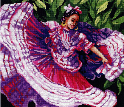 Designed by: Linda Gillum. An art form that is so appealing and full of passion. This young lady's soul emanates poetic inspiration as she stamps out her Jalisco roots to the relentless folkloric rhythms. Join in as you stitch to the beat of the footsteps. This colorful design will add a splash of color wherever you display it.