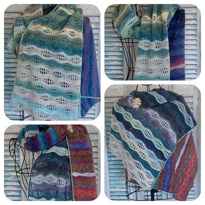 The pattern uses a combination of four different wave stitches, starting with subtle narrow waves and transitioning through to wide lacy waves, reflecting the sea from the horizon to the beach. The colours also change as the sea approaches the beach, making each Spanish Sunset Shawl a unique creation.