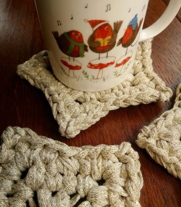 A super quick make in Chunky/Bulky yarn, perfect for your holiday coffee table or to make as gifts. If you love a bit of sparkle at Christmas use the gorgeous glittery Paintbox Recycled Ribbon Metallic as I have. It makes stunning festive coasters or make a hanging loop for a really pretty festive decoration that twinkles when lights catch it. You could also string together as gorgeous sparkly bunting. This is a wonderful project to play with size, you can easily go smaller, just use a smaller hook and thinner yarn.