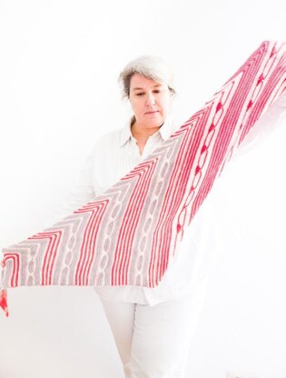 This shawl has a triangular shape starting from one edge to the other. Its shape is created with double decreases and increases on each side.