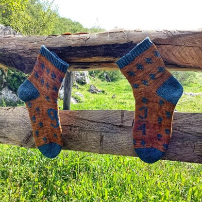 Estos calcetines mágicos están inspirados en Harry Potter, tejidos de arriba a abajo en circular llevan varios motivos tejidos a colorwork con unos rayos, unos pasos y en el centro del empeine el motivo de 9 3/4, el talón se trabaja con vueltas cortas.