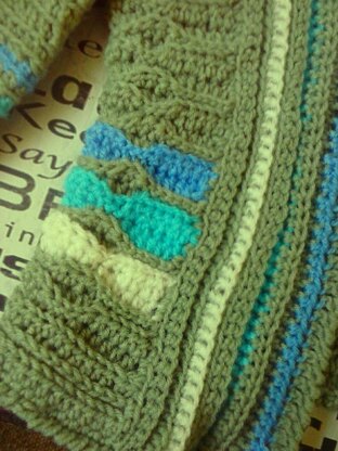 Materials: (approx...different yarns will have different yardage...example used Robin 4ply and Marriners Dk) 150g /340 yards of 4ply yarn. 25g/57 yards each of 3 different contrast colours in DK/light worsted yarn. Size 4.00mm crochet hook. Stitch markers. Large eyed tapestry needle. Six pairs of metal or nylon hooks and eyes. (A zip could be used instead)