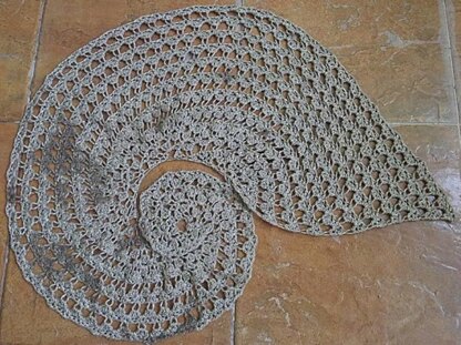 It is a top-down, spiral cowl/shawl. It needs to be blocked so that it will lie flat. If it is small, wear it like a cowl. If it is big, wear it like a shawl. Any yarn and colours will be great for it. Gauge is not important.