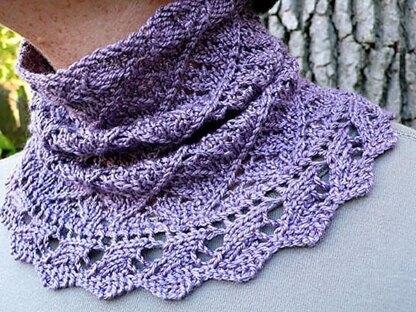 Knit in a luscious fiber blend, this spiraling neckwarmer will provide a pretty and cozy extra layer at the throat. Finished with a knitted-on border of turning leaves, this piece knits up quickly on circular needles and makes a beautiful gift.