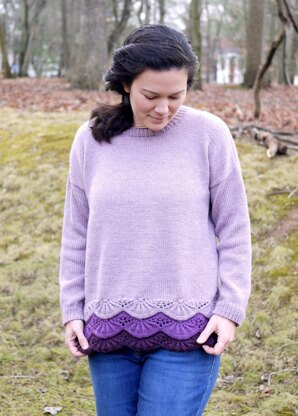 Splendor features a lace scallop design worked up in ombre fashion making this sweater interesting. Sweater showcases a drop shoulder style with positive ease in the body and slim-fit sleeves. Sweater is worked flat to shoulders which are joined with 3-needle bind off, sleeves are then picked up and knit down to cuff. Designed to be worn with 6-10in (15-25cm) of positive ease. Sample shown in size 44in (110cm) with 6in (15cm) of positive ease.