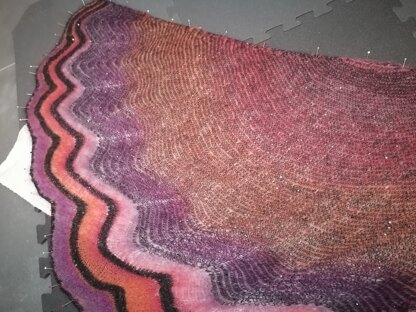 This crescent shawl is worked from the top down. Starting with a two-colored garter stitch, it’s soon transformed into an old shale pattern. By adding waves the shawl is growing asymmetrically. The edging is worked with an I-cord.