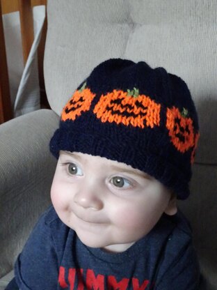 A cute little hat surrounded by adorable smiling pumkpins. Perfect for a Halloween baby boy or girl or just for wrapping up on Autumn days.