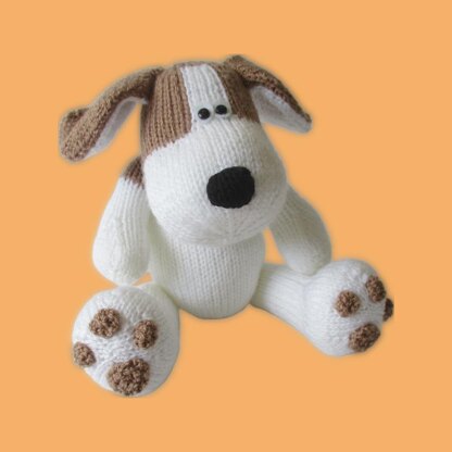 Knit Spot the huggable puppy using intarsia colour-work patterns in stockinette, with increases and decreases for shaping. Designed by Amanda Berry @fluffandfuzz, Spot is knitted in acrylic DK yarns on single pointed needles (not in the round). For confident beginners and above, other techniques used include casting on and off, knits, purls, increases and decreases, and seaming to finish.