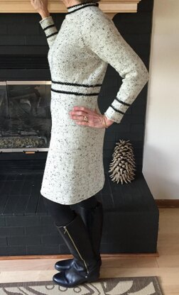An ideal beginner sweater dress that can be dressed up or down. The top down construction and raglan sleeves make it an easy knit, and shaping with Linen st detailing at the waist and cuffs makes it flattering to all shapes.A loop and button closure at the neck complete this design.