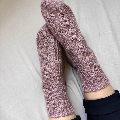 The Spring Bloom Socks feature a romantic lace pattern over the instep that includes bobbles and cables. They are knit toe up in the round using the Magic Loop method. The pattern describes 5 different sizes with an adjustable foot length.