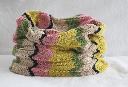 This Spring Cowl is light and airy in its stitch pattern and drape. It is knit with a DK weight cotton and can also be knit in a wool for the winter. It looks great over anything from a tank to a sweater. The sample was knit with Rowan Cotton Glace at 23sts=4" in stockinette. The finished measurement is 6"wide and 27" around neck with gives a nice loose drape. You will need: #8 needle 60 yards of color A 100 yards of color B 125 yards of color C 75 yards of Color D 60 yards of color E