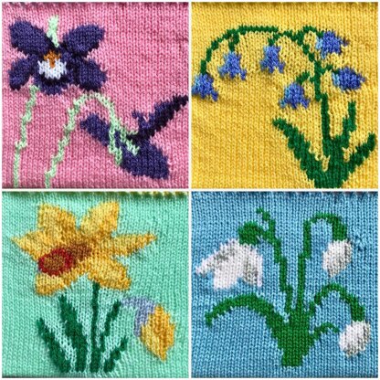 Here is a set of 4 Spring flower knitting charts with instructions on how to turn them into some pretty gift bags. They feature daffodils, bluebells, snowdrops and violets.