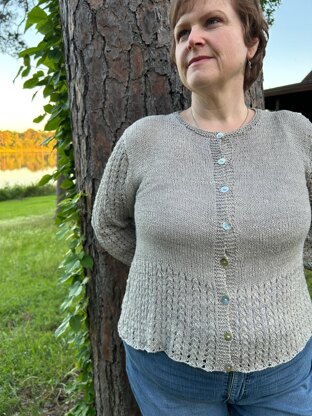 Spring Lake Cardigan has a deep lace hem and lace all the way up the sleeves. This light and breezy lacy cardigan is made from rustic silk, so it’s great for spring through fall. It is meant as a companion for the matching Spring Lake top. This is knit in the round to the underarms, and you can customize the depth of your lace hem and body length