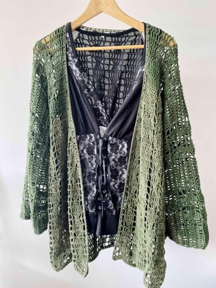 This oversized Boho style crochet cardigan is worked in one large piece, then just sew the side seams and work a quick edging around the neckline and sleeves and it’s ready to wear!