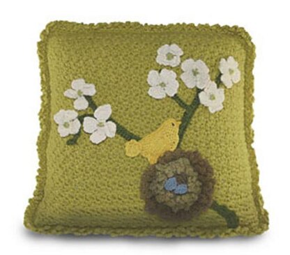SPRING LIFE This whimsical pillow will brighten up any decor. Create as is, or choose the colors you love. Pillow shown is 14 x 14" (35.5 x 35.5) but can be made in any size you choose. The chunky texture of the pillow and nest, paired with the softness of the flowers and bird creates a contemporary look. The unexpected red back adds an additional sense of fun.