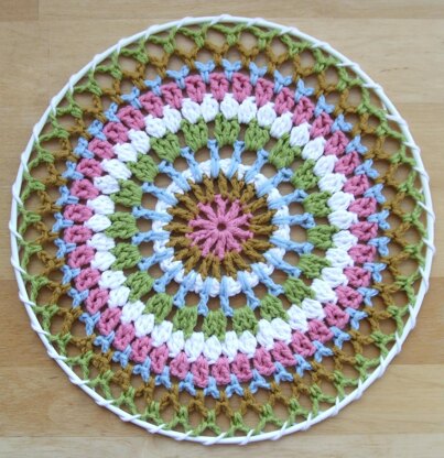 This is a digital pattern for a mandala of about 8 inch / 20 cm in diameter, it will be attached to a ring of 9 inch / 22 cm diameter. After payment you can download the pattern. Instructions are given in text, there are also detailed pictures of each round, and also instructions are given on how to attach your mandala into a metal ring. This is an advanced beginners pattern. US crochet terms are used.