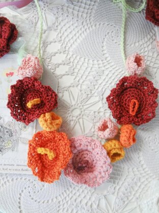 This listing is for a PDF pattern for crocheted necklace and NOT actual item. Yarn and hook: sport yarn of your choice and colors (I love working with Phil Cotton #3 and Tango) and a 3 mm hook (UK11) (US 10/3). Note that you can use whatever yarn size/ weight (and relevant hook for that weight) you like/have at hand. That will only influence the size of your flowers. Hence, smaller weights will yield tinier flowers, heavier weights will yield bigger flowers. Stitches (American terminology): chain (ch), slip stitch (sl st), single crochet (sc), single crochet 2 together (sc2tog), half double crochet (hdc), double crochet (dc). Other: tapestry needle for weaving ends, sewing needle and thread for sewing the filaments, and scissors.