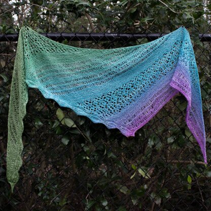 The stitch patterns used in this shawl are intermediate level. They require some attention, specifically for the floral mesh lace section. The leaves require some attention at first, but they can also be memorized. Specific techniques in the pattern include working stitches together through the back loop, SKP, SSK, and yarn overs. These techniques all have linked video tutorials within the pattern.