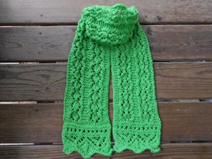 Do you want a fun and quick to knit scarf that is easy to work and takes only as much yarn as you want to use? Try this pattern. It is a simple to learn lace pattern stitch. You can knit is for as long as you want or as much yarn as you have. If you are a beginning lace stitch knitter, this pattern is for you! Try it in variegated or self-striping yarns for a fun scarf that matches you outfit!