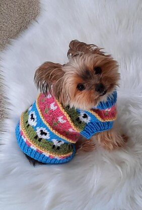 Spring Pastures, A sweet and colourful spring time dog sweater showcasing sheep and tulips. Please note: This pattern is for personal use only. Selling of this pattern or finished product of this design is prohibited. * This knitting pattern is written in English only.