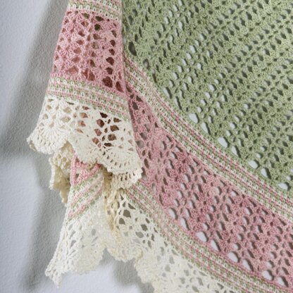 Spring is my favorite time of year. It's a time for starting over with new growth; the dreary days of winter are gone and the blossoms are blooming. This delicate shawl is worked in spring colors from the top down to the edging with fingering weight yarn.