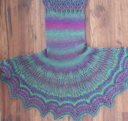 This pattern is knit completely in the round from the lace edge of the cowl through to the lacy work of the body of the poncho. Done in a self-striping sock yarn (using about 800 yards), the light and airy poncho allows for a large cowl to be pulled up into a hood on blustery Spring days.