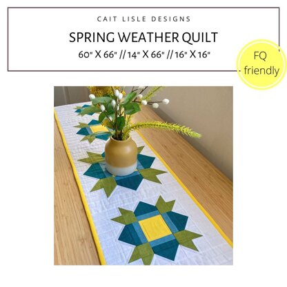 Making use of negative space and assembled using the classic Half-Square Triangles and Flying Geese blocks, this quilt is a great skill builder.\n\nThe downloadable pattern includes:\n\nHelpful tips and detailed diagrams to help you piece your quilt top\nFull instructions for a throw quilt, runner and cushion\nColouring pages to help you choose your fabric layout and colour scheme\nFat Quarter and scrap friendly\nSuitable for beginners\n\nShare your projects with #SpringWeatherQuilt and #caitlisledesigns!