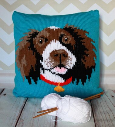 Knitted cushion cover featuring a beautiful Springer Spaniel dog in a fun pop art style! This can be used to cover a cushion pad, or a box canvas if you’d prefer to display your hard work on the wall and have a unique piece of art!