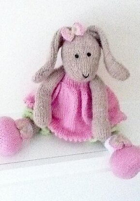 This is Spingtime Bunny she measure between 17 and 19 inches high . so she is an ampule bunny which i am sure will make any little girl happy. She has adorable bloomers and dress with matching bows. I have made her with Dk wieght yarn but worsted will be fine , just adjust your needle size accordingly.