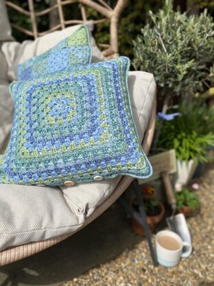 I designed this simple granny cushion cover back in 2020 when I was furloughed but have revisited the pattern when I was sent this gorgeous yarn to test. The calm colours of blues and greens are stunning together. It’s perfect for crochet accessories - soft and durable, the colours are beautiful and it’s a dream to crochet with. The finished cushion is perfect for use in my happy shed where you’ll often find me in the spring/summer months in my lunch breaks. The inspiration was taken from the colourful pots at the entrance of my shed, which is an upcycled project turning a neglected dog kennel into a crochet place. You can follow my crochet journey over on Instragram @eightbysix