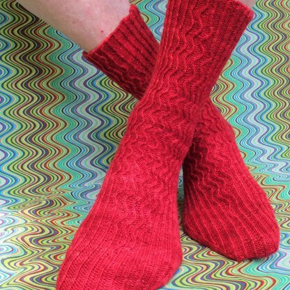 Squigglez is a unisex sock that has traveling in mind and features a central knit thru the back loop column that moves to and fro down the leg picking up its neighboring columns along the way until all the columns are traveling. The pattern can be worked one of three ways: Original, featuring off-set traveling columns and an unusual gusset; Alternative, featuring synchronized traveling columns and an unusual gusset; and finally K.I.S.S. (Keeping It Simple Squigglez) which has synchronized traveling columns and a traditional heel flap and gusset. The unusual gusset allows you to carry the pattern all the way around the gusset and requires no picking up of stitches instead you’ll work just one giant heel turn to return back to your original stitch count. Although the pattern is not written for two colors it looks wonderful that way - just work your purl stitches in one color and your knit thru the back loop stitches in another (be sure to adjust your gauge accordingly).
