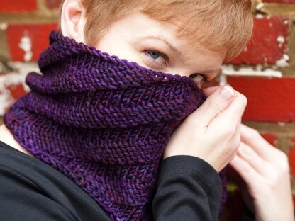 This is a super-squishy cowl, taking less than one skein of yarn and is good for travelling. It’s completely reversible, a quick knit, and good for gifts.