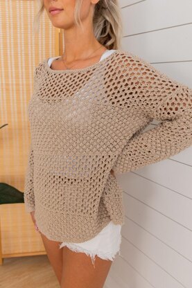 This boxy pullover combines mesh with Trinity stitch in horizontal panels to create a wearable mesh top. The drop-shoulder sleeves are designed for a relaxed fit and the wide, trim ballet neckline allows the garment to behave a little slouchy. The perfect resort pullover!