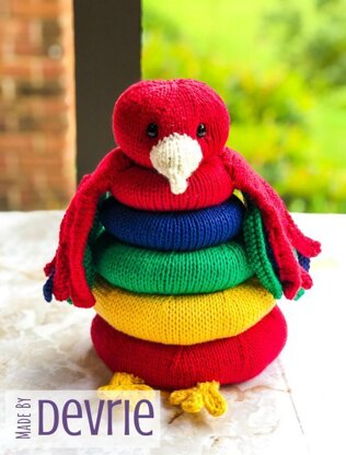 This adorable knitted stackable ring toy is the perfect gift for any new mom or child in your life. Isn’t it the cutest little parrot you have ever seen? Made with cotton yarn, it is easy to clean and manage. It will provide your child hours of fun. This toy is made by knitting in the round using US size 5 needles. It will stand about 12 inches tall and is about 8 inches wide. It leans more toward advanced on the skill level but would be a nice challenge for an intermediate knitter.