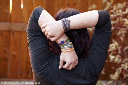We all have them, those tiny bits of yarn too special to throw out. Instead of putting them in a bowl, why not make a bracelet – or a necklace? This is a recipe to make bracelets sized to fit your arm and desired length.