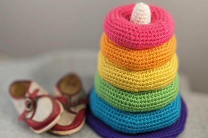 These stacking baby rings will give your baby/toddler something to practice/improve their fine motor skills. Using any desired colors of worsted weight yarn and polyester fiberfill, these rings are soft and easy for babies to handle. The flat base and the bottom of the cone are stiffened with plastic canvas, strengthening the base/cone structure.