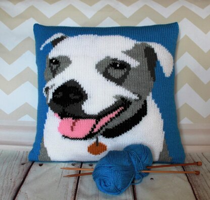 This animal / pet portrait knitting pattern features written instructions and an intarsia chart for the main picture.
