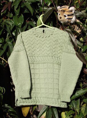 Here is a junior version of my adult “Staithes” design, which has been so popular with it’s rich mix of pattern textures and stitches. Inspired by the beautiful coastal village of Staithes in North Yorkshire, this design reflects elements of gansey style sweaters. Suitable for girls and boys, the instructions include a version with or without bobbles around the neckband. Unlike the adult version, this design has a button neck opening on the back.
