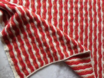 A soft woollen blanket in warming colours, ideal for cosy nights in front of the fire. The pattern is great for beginners as it is simple once started and looks impressive when finished.