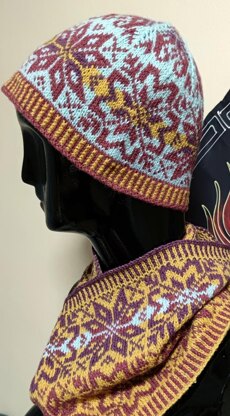 Both cowl and beanie are worked in the round, using only two colors per round. The beanie is designed to fit a medium-sized adult head. Yarn requirements: Laxdale 2-ply Jumper Weight: 2 skeins Rose Pink (Color A) 1 skein Lichen (Color B) 2 skeins Heather (Color C) 1 skein Morning Sky (Color D)