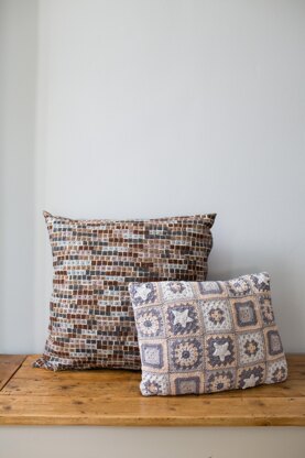 A selection of different granny squares are used to create this fun cushion., worked in an on trend array of grey shades