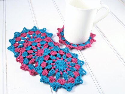 These beautiful starburst coasters are made in the round in a mandala-type design. Each round is made in alternating colours (or you could make them all in the same), using any scraps of cotton 4ply/sport weight yarn. They look lovely dressing up your table and make a brilliant gift. Gauge does not matter for this project.