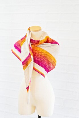 Blocks of stockinette stitch alternate with increasingly large blocks of knotted openwork worked in the contrasting colors. The length of the shawl may be increased or decreased by adding or subtracting additional blocks.