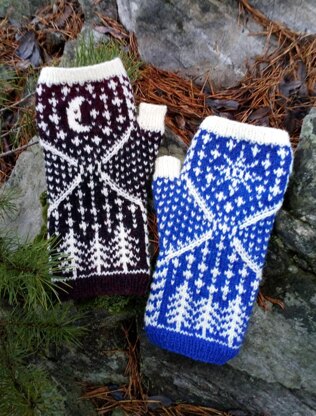 Starfall Mitts is a stranded colorwork design with a few stitches that travel across the mitten, similar to shooting stars traveling across the night sky.