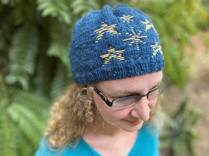 THE STARFIELD HAT IS A CHOOSE YOUR OWN ADVENTURE PATTERN. There are two types of brim (ribbed or folded), two techniques for the star pattern (stranded colorwork or Roosimine, an Estonian inlay technique), and finally guidance for different lengths if you want a fitted beanie or more of a slouchie style. Stranded colorwork will give you a continuous design around the circumference of the hat. Roosimine is a technique that results in a design similar to embroidery, but you do it as you are knitting. This results in the pattern being only on the front of the hat, with a slightly larger design.