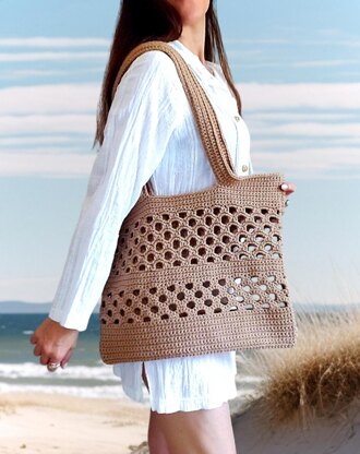 Very easy basic pattern for the Starfish Bay Beach Tote! This is an envelope style tote so there is no bottom base. It is made in 2 identical flat pieces and then the sides are sewed together. The final measurement is about 17 inches wide and 14" high (not including the shoulder straps). The pattern uses basic American crochet terminology and if you have experience with reading a written pattern this is a great pattern for a beginner.