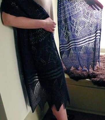 Shawl size may be altered by using a different yarn weight or different needle sizes, and by lengthening or shortening the body section (instructions included).The sample shawl, knit to the gauge and length stated in the pattern, gained approximately 30% in length and 20% in width during the blocking process.