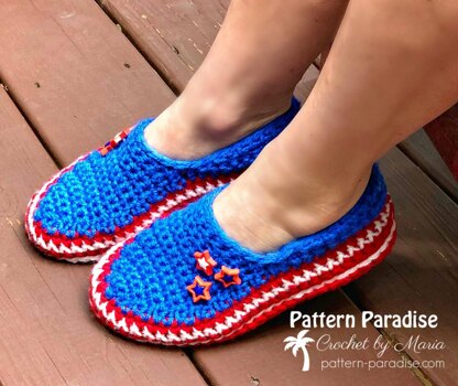 I designed these slippers in honor of the 4th of July celebrations in the United States. They are made with bulky yarn, they sport a double sole and close fitting foot and ankle for comfort and maximum fit. I sized them for men and women and therefore the sizing is based on foot length. These have become my favorite slippers!